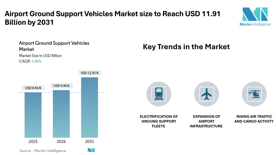 Airport Ground Support Vehicles Market size to Reach USD 11.91 Billion by 2031 Electrification, Leasing Models, and Cargo Expansion Shape Market Growth- Mordor Intelligence