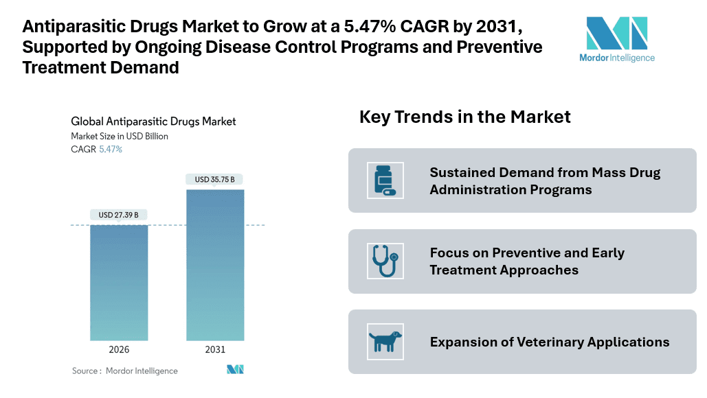 According to Mordor Intelligence, the antiparasitic drugs market size is expected to grow from USD 25.97 billion in 2025 to USD 27.39 billion in 2026 and is forecast to reach USD 35.75 billion by 2031 at 5.47% CAGR over 2026-2031. The Antiparasitic Drugs Market is supported by routine treatment requirements for protozoal, helminthic, and ectoparasitic infections, particularly in regions with high disease burden. Preventive chemotherapy programs and government-led public health initiatives play a central role in sustaining Antiparasitic Drugs Market Growth across endemic regions.
