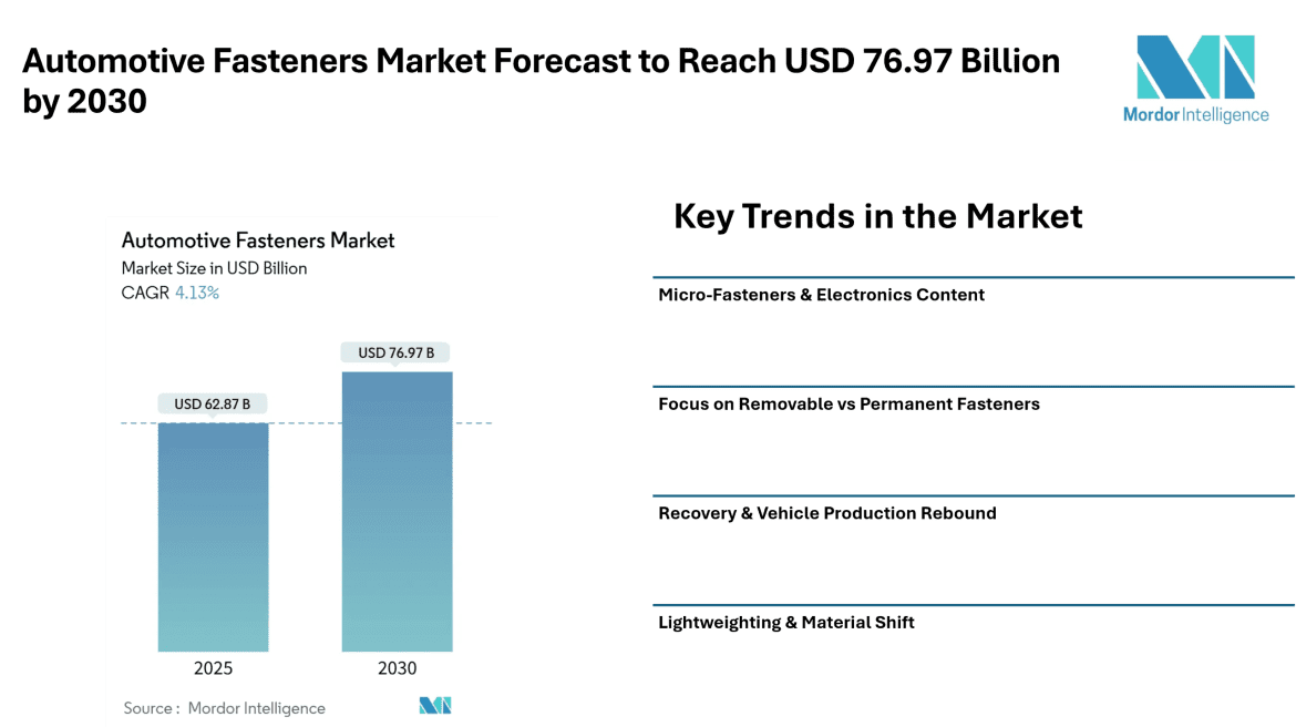 Automotive Fasteners Market Forecast to Reach USD 76.97 Billion by 2030, Driven by Rising Vehicle Production and Lightweight Material Adoption – Mordor Intelligence