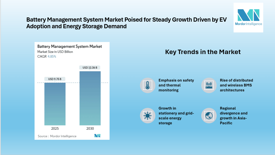 Global Battery Management System Market is anticipated to expand from an estimated USD 9.75 billion in 2025 to approximately USD 12.36 billion by 2030, reflecting a compound annual growth rate (CAGR) of about 4.85 %. This growth is underpinned by rising demand from electric vehicles (EVs), energy storage systems, and more stringent safety and performance requirements for battery packs across sectors. With Asia-Pacific set to remain the largest regional market and emerging regions catching up, the market landscape is shifting toward more modular, connected, and safe BMS solutions.
