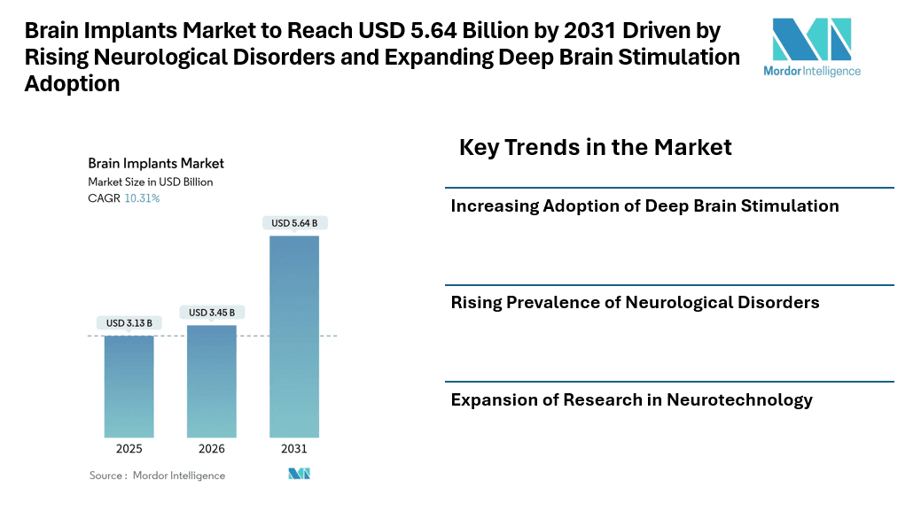 According to Mordor Intelligence, the brain implants market size is valued at USD 3.45 billion in 2026 and is projected to reach USD 5.64 billion by 2031, growing at a CAGR of 10.31% during the forecast period. The growth of the brain implants market is primarily supported by the rising prevalence of neurological disorders, increasing demand for minimally invasive neurosurgical procedures, and expanding adoption of deep brain stimulation therapies.