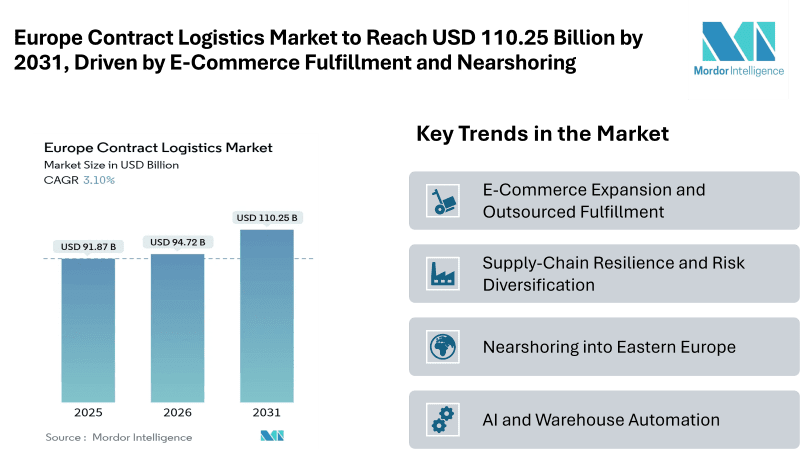 According to Mordor Intelligence, the Europe contract logistics market size is estimated at USD 94.72 billion in 2026, rising from USD 91.87 billion in 2025, and is projected to reach USD 110.25 billion by 2031, registering a CAGR of 3.10%. This steady Europe contract logistics market growth reflects the region’s mature yet adaptive logistics landscape, where outsourcing continues to gain ground across transportation, warehousing, and value-added services.