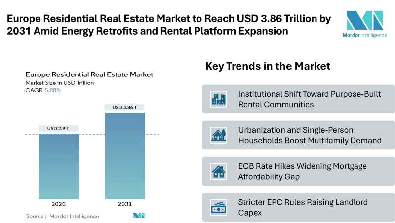 According to Mordor Intelligence, the Europe residential real estate market is projected to grow from USD 2.9 trillion in 2026 to USD 3.86 trillion by 2031, registering a 5.88% CAGR during the forecast period. Structural housing undersupply, tightening vacancy in major cities, and policy-driven sustainability mandates are reshaping capital allocation across the region. Demand continues to exceed supply in several large metropolitan areas due to lagging permits and delayed new starts. At the same time, energy compliance obligations under Directive (EU) 2024/1275 and national transpositions are accelerating deep retrofit investments and influencing both pricing and portfolio strategies—particularly in urban multifamily assets.