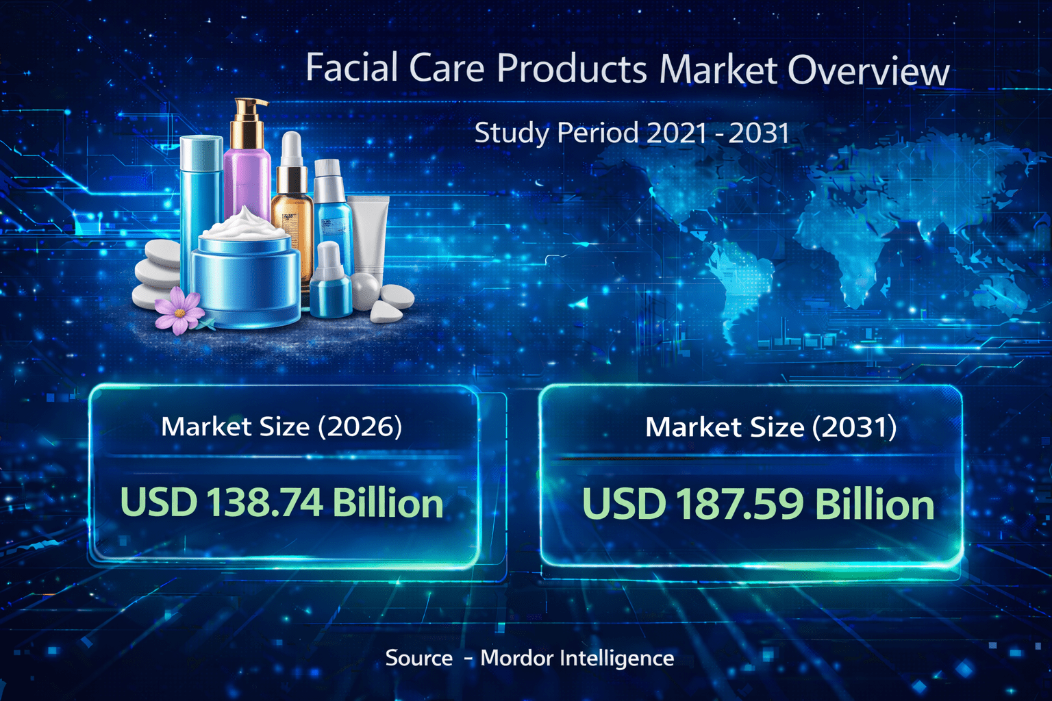 The global facial care products market size is projected to grow from USD 138.74 billion in 2026 to USD 187.59 billion by 2031, reflecting steady expansion during the forecast period. The positive facial care products market growth trajectory is fueled by increasing awareness of skin protection, anti-aging needs, and safe ingredient formulations.