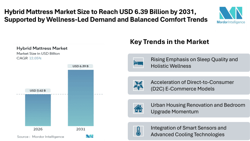According to Mordor Intelligence, the Hybrid Mattress Market Size stood at USD 3.23 billion in 2025 and is expected to grow from USD 3.62 billion in 2026 to USD 6.39 billion by 2031. The market is gaining consistent traction within the global sleep products space as consumers seek mattresses that combine comfort, durability, and reliable support. This growth underscores the rising preference for hybrid constructions that blend innerspring systems with foam and micro-coil layers to deliver a balanced sleep surface.