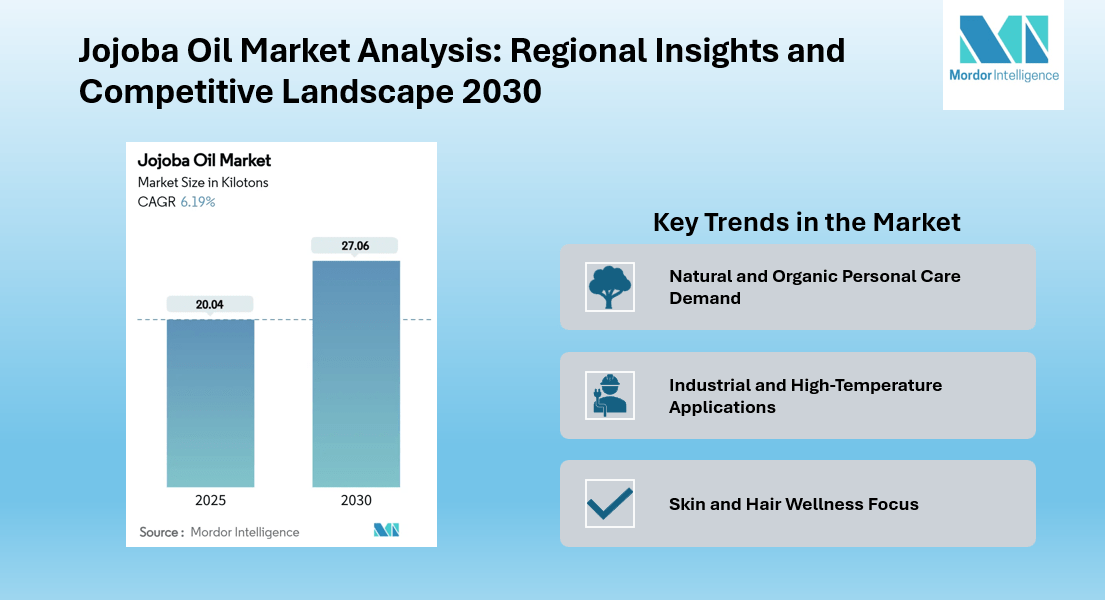 Home Press ReleasesJojoba Oil Market Growth Projected at 6.19% CAGR to Hit 27.06 Kilotons by 2030 | Cold-Pressed Oil Gains Popularity | Says Mordor Intelligence