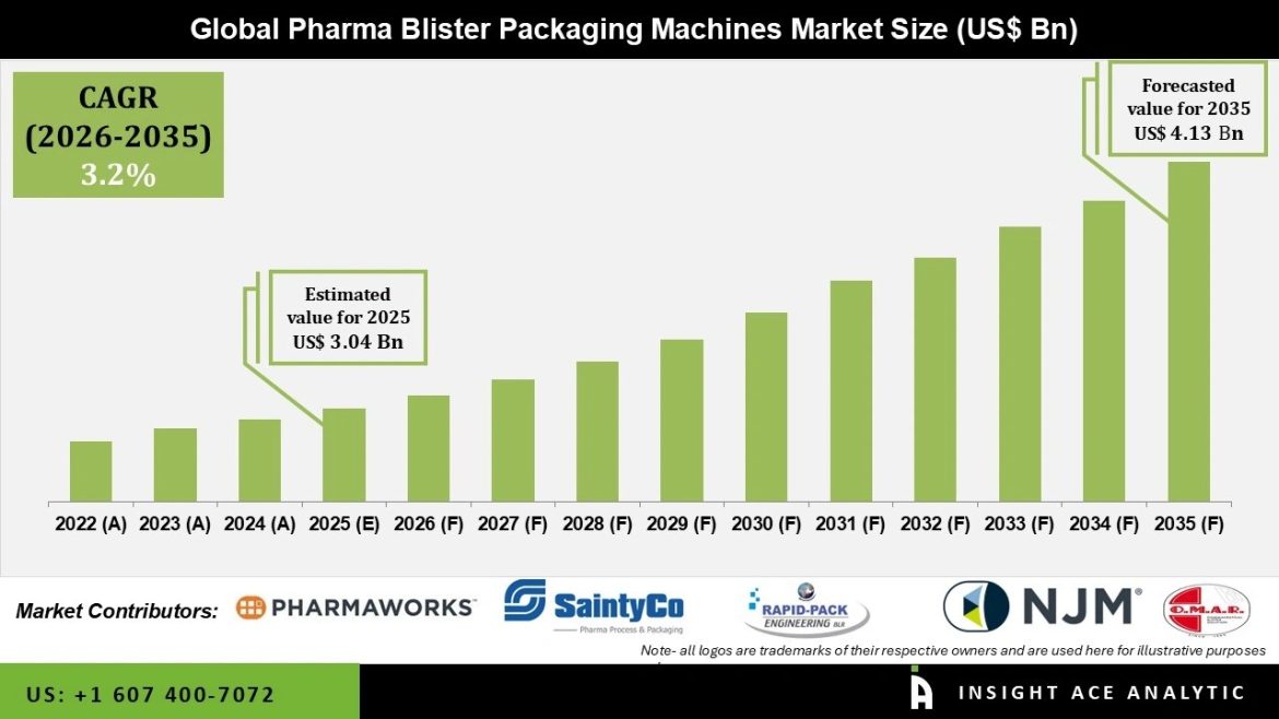 Pharma Blister Packaging Machines Market Size is valued at USD 3.04 Bn in 2025 and is predicted to reach USD 4.13 Bn by the year 2035 at a 3.2% CAGR during the forecast period for 2026 to 2035.