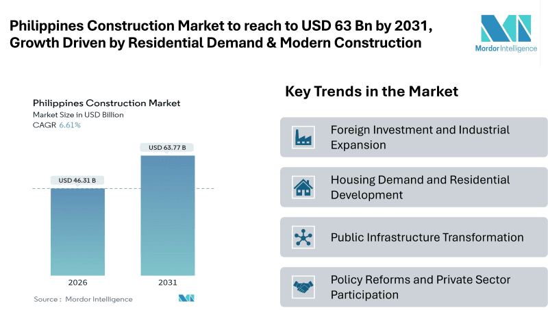 According to Mordor Intelligence, the Philippines construction market size was valued at USD 43.44 billion in 2025 and is projected to expand from USD 46.31 billion in 2026 to USD 63.77 billion by 2031, registering a CAGR of 6.61%. Market growth is largely supported by strong public-sector spending under the government’s Build Better More program, which continues to prioritize large-scale infrastructure development and nationwide connectivity improvements.