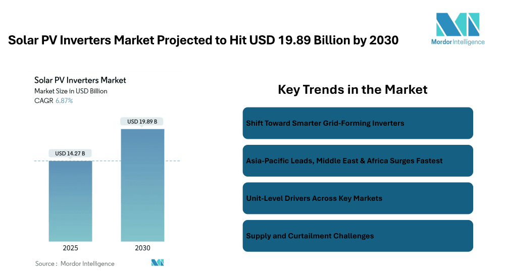 Solar PV Inverters Market is set to grow from USD 14.27 billion in 2025 to USD 19.89 billion by 2030, registering a compound annual growth rate (CAGR) of 6.87%.