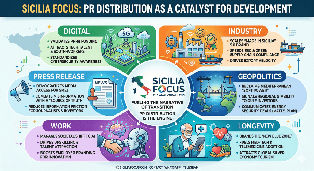 Below is a comprehensive analysis of how strategic press release distribution serves as the primary engine for development across the six pillars of Sicilia Focus.