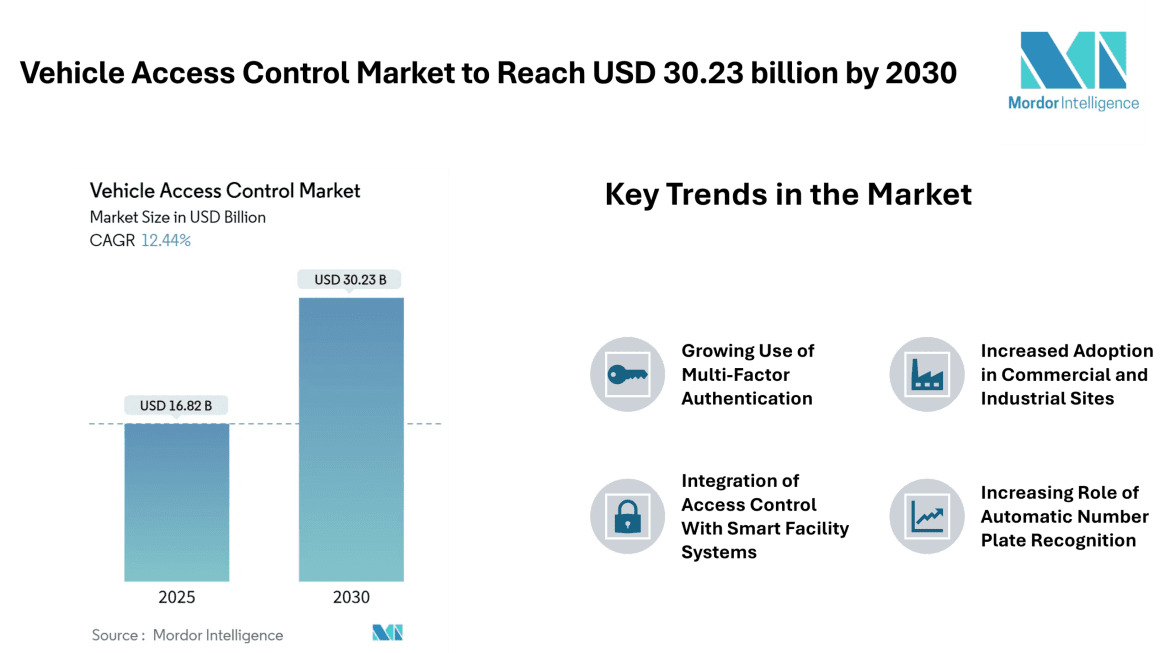 Home Press ReleasesVehicle Access Control Market to Reach USD 30.23 billion by 2030, Driven by Rising Perimeter Security Needs and Integration of Smart Authentication Technologies – Mordor Intelligence
