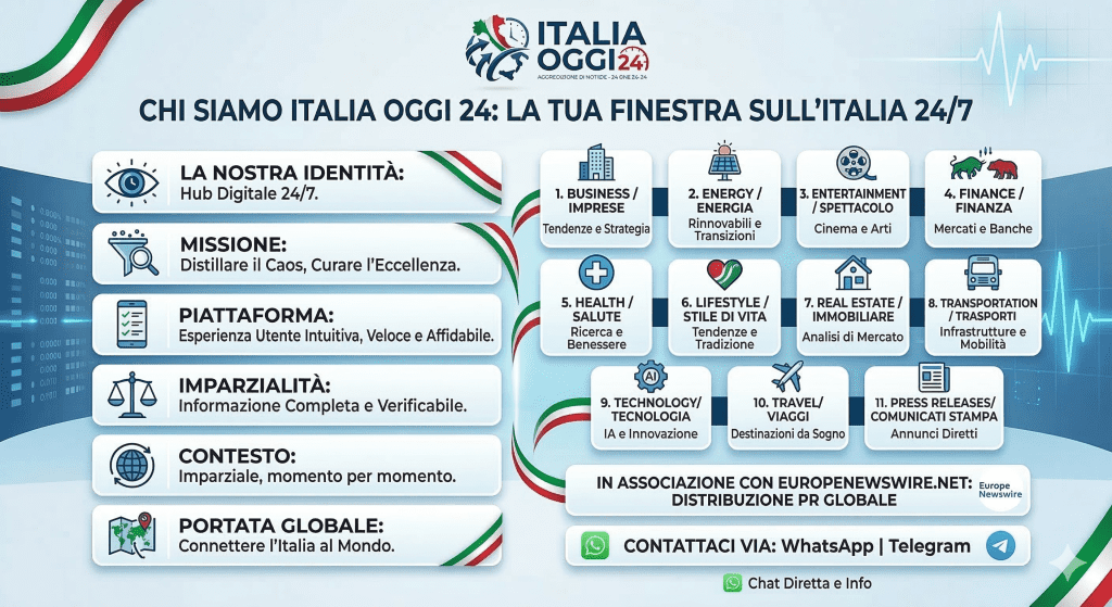 Italia Oggi 24 è molto più di un semplice aggregatore di notizie; è la tua finestra digitale, aperta 24 ore su 24, sul cuore pulsante dell’Italia. In un’epoca dominata dal sovraccarico informativo, la nostra missione è chiara: distillare il caos, curare l’eccellenza e offrire una visione limpida, imparziale e completa degli eventi che plasmano la nostra nazione, momento dopo momento.